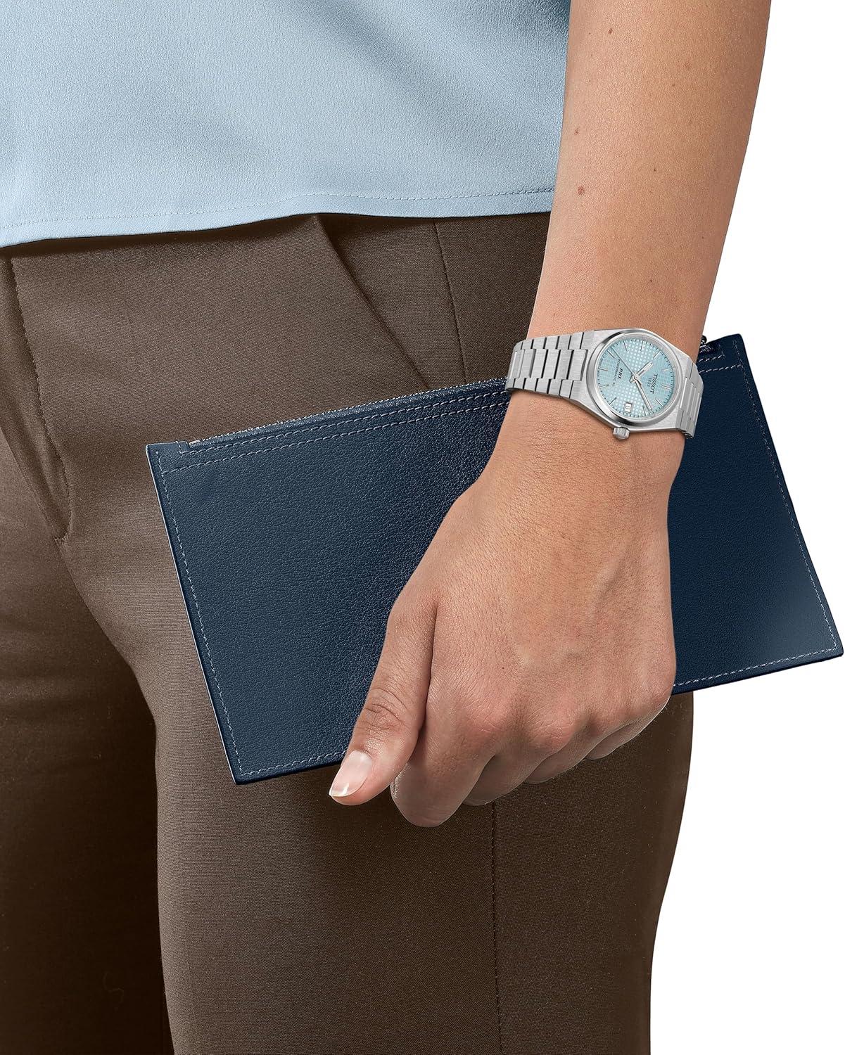 Tissot PRX 35mm Powermatic 80, where timeless aesthetics meet contemporary technology. This 35mm watch exhibits a high-quality steel case and a vibrant ice blue dial. This trendy shade casts an exquisite hue, perfectly catching and reflecting light. The distinctive waffle dial pattern adds a unique sophistication to this automatic model. Equipped with water resistance up to 100 meters and a Nivachron™ balance hairspring, the PRX ice blue becomes an alluring choice for the style-conscious and practical watch enthusiast. The satin-finish steel bracelet, complete with a triple-blade folding steel clasp, ensures an impeccable fit. Showcase your taste with the Tissot PRX 35mm Powermatic 80 in ice blue.